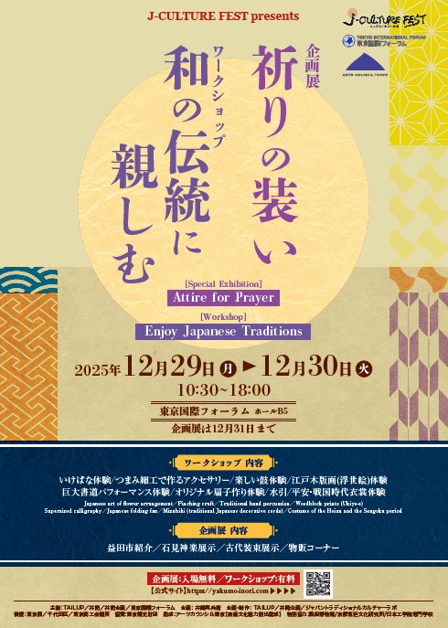 東京国際フォーラムホールB5にてワークショップ「和の伝統に親しむ」、企画展「祈りの装い」を同時開催。